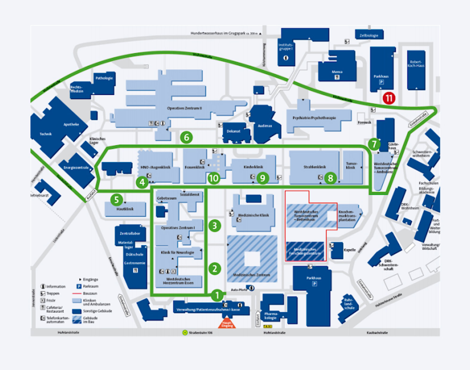 Das Universitätsklinikum bietet auf 218.000 m² ein maximales Versorgungsnetz, bestehend aus rund 26 höchst spezialisierten Fachkliniken. Damit Sie diese schnell und einfach erreichen können, hat die Stiftung Universitätsmedizin Essen für Patient:innen und Besucher des Uniklinikum Essen einen besonderen Shuttle-Service eingerichtet.
