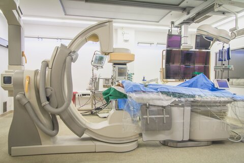 In unserem anästhesiologischen ZVK-Labor werden für alle Fachabteilungen des Universitätsklinikums Essen zentrale Venenkatheter (ZVK) oder Dialysekatheter angelegt. Um die Intervention für unsere Patient:innen sicher und schonend durchführen zu können, erfolgen alle Anlagen ultraschallkontrolliert und unter örtlicher Betäubung an einem komplett ausgestatteten Anästhesiearbeitsplatz.